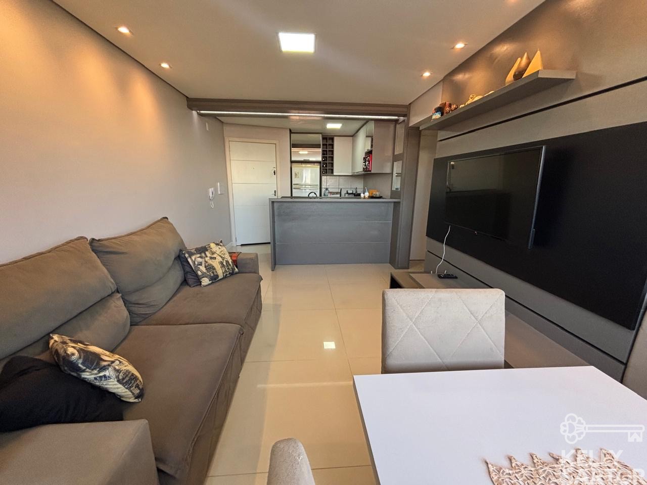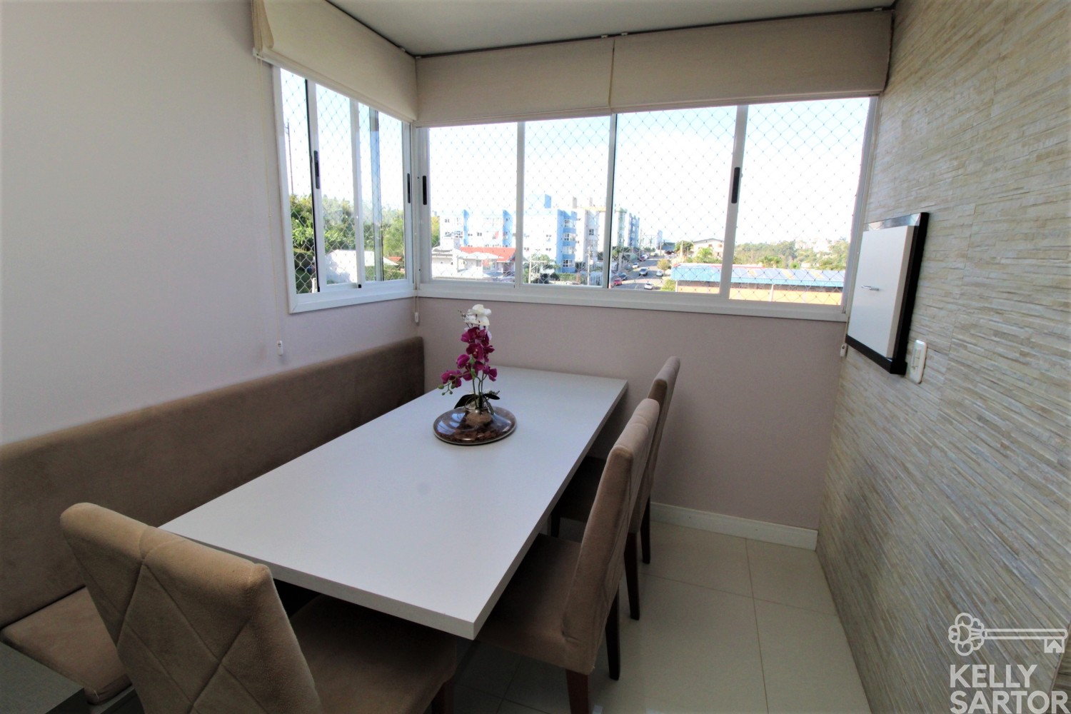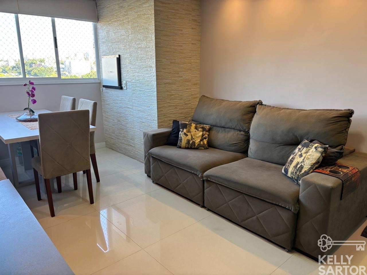 Descrição › KELLY SARTOR VENDE excelente apartamento semi-mobiliado à venda, no bairro São João/Vinhedos, composto por 02 dormitórios, 01 banheiro social, cozinha com bancada, sala com sacada integrada e churrasqueira. Apto com rebaixe em gesso, piso porcelanato na sala e banheiro, piso vinílico nos dormitórios e piso cerâmico na cozinha. Posição Solar leste e norte. Área Privativa: 47,67m². 1 Box de garagem.