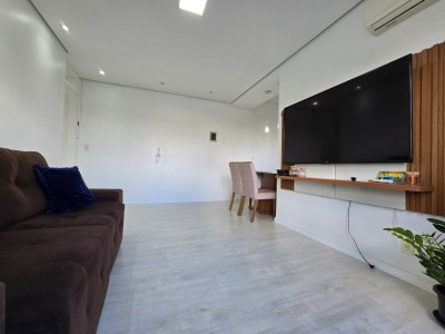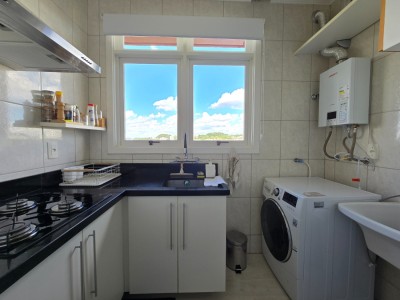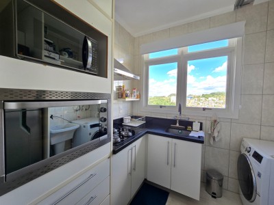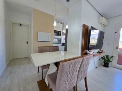 A sala integra-se à cozinha, que conta com churrasqueira, proporcionando funcionalidade e um espaço ideal para receber amigos e familiares. O imóvel dispõe ainda de sacada aberta com vista definida, ar-condicionado split instalado e aquecedor de água quente já em funcionamento.