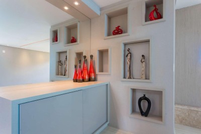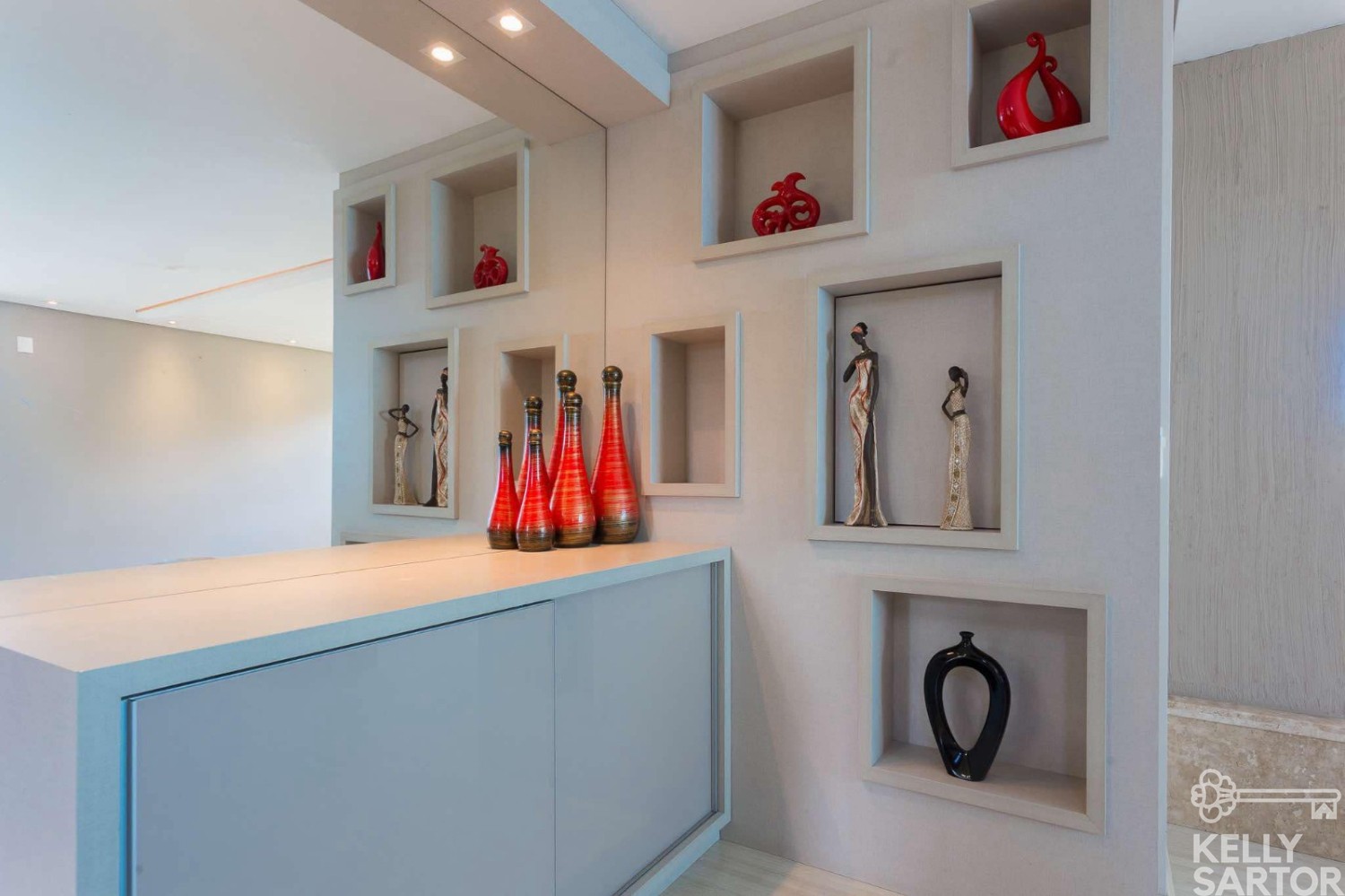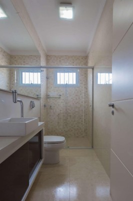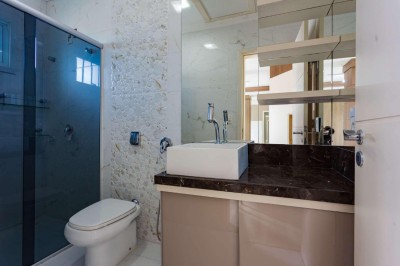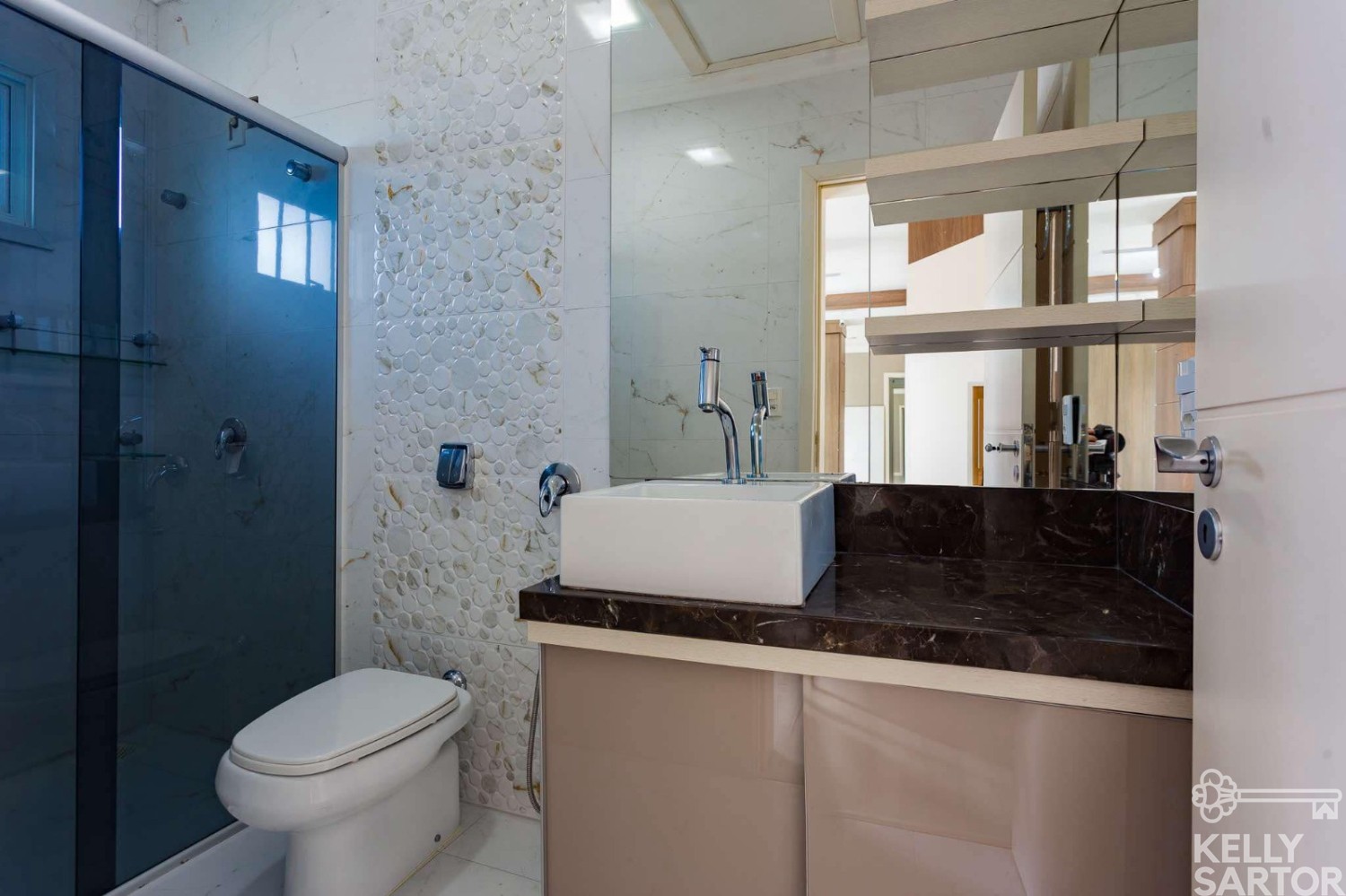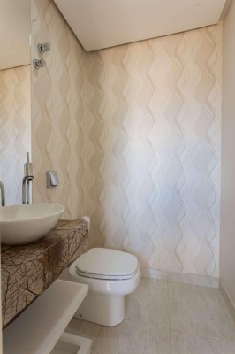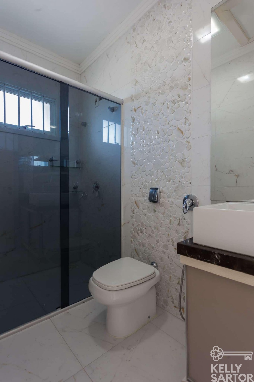 A casa foi projetada com acabamentos de alto padrão, incluindo rebaixo em gesso com iluminação em LED, telhado de concreto plano, aberturas em alumínio com venezianas e telas mosquiteiras, além de vidros laminados que garantem conforto térmico e acústico.