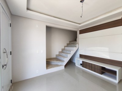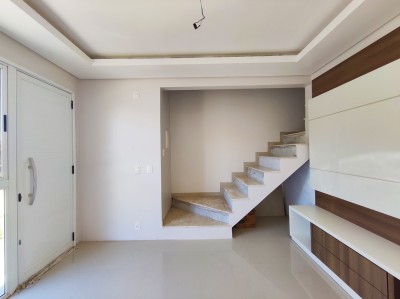 Sobrado com 65m², parte inferior com cozinha, sala de estar e lavabo, parte superior com 2 dormitórios e 1 banheiro.