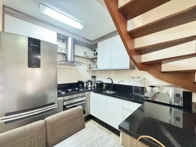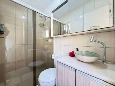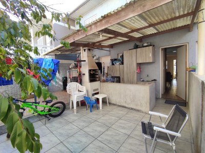 O sobrado conta com 2 dormitórios, sendo um deles com sacada aberta, sala de estar e jantar integradas, cozinha com acesso à área externa nos fundos com churrasqueira, área de serviço e banheiro social. Dispõe ainda de espaço de estacionamento coberto para 1 veículo. Permanecem no imóvel os móveis fixos, além de contar com piso vinílico e piso cerâmico, e hidrômetro individual.