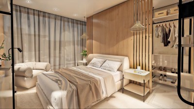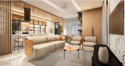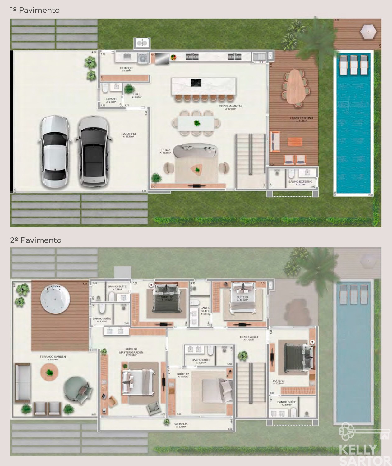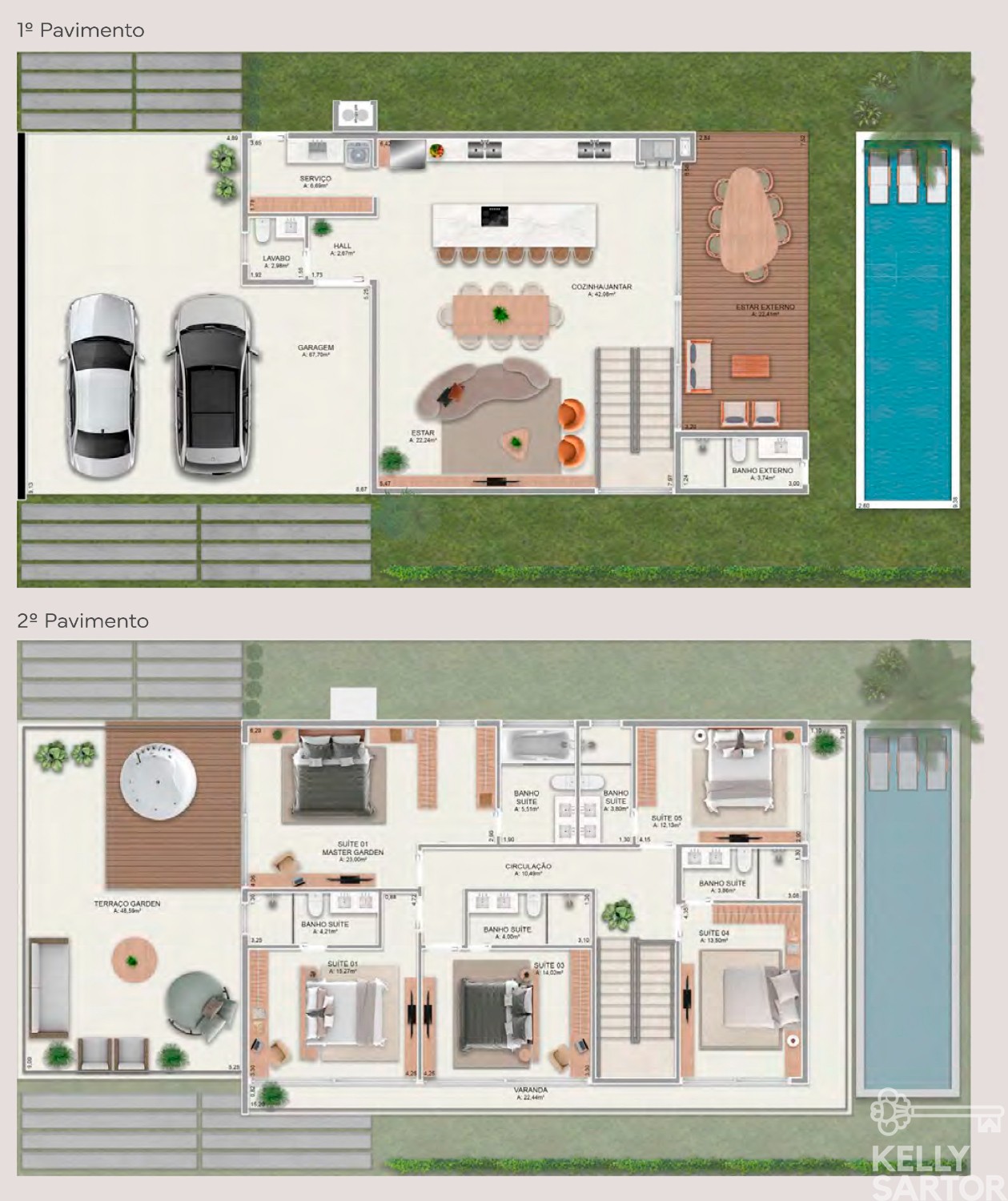 * Adicionais: deck em porcelanato madeira, piscina privativa, banheiro externo e pergolado de madeira.